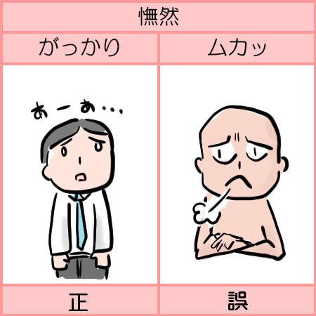 憮然:失望してぼんやりとしている様子